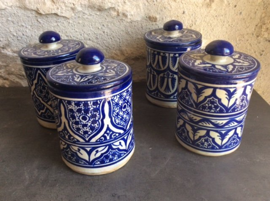 Set of 4 Vintage Moroccan Pottery Ginger Storage Jars in Traditional Flow Blue Patterns