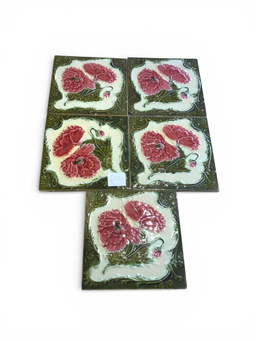 Five matching antique ceramic glazed 6 inch square tiles made around 1900 probably. Commonly used in old cast iron fireplaces (they usually have 5 down each side) or in wash stand splashbacks, though they can be used in lots of decorative situations. These ones have an embossed, tube-lined floral design with red carnations and green leaves. Price is for all five Dimensions: 154mm sq x 9mm