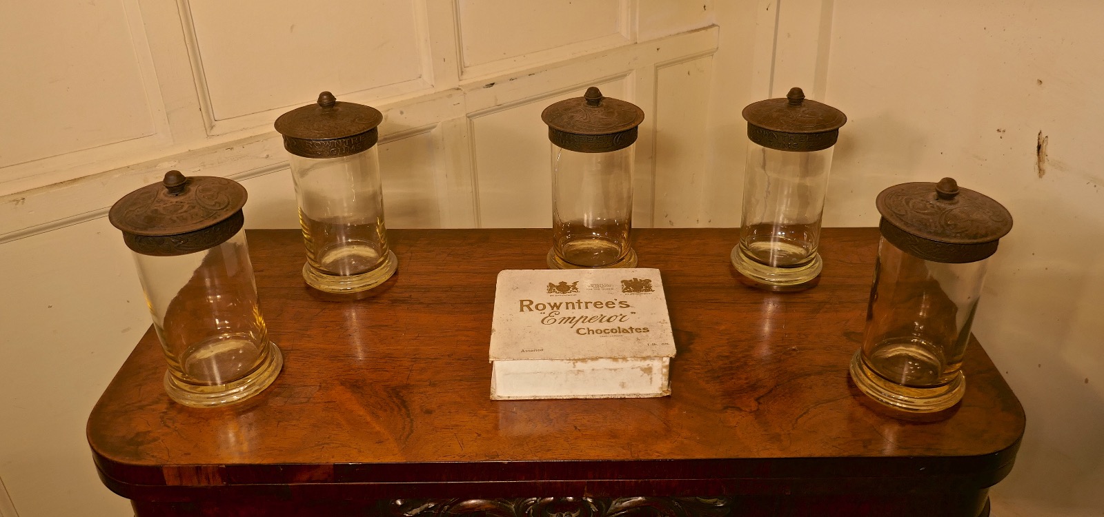 Set of 5 Rountree’S Sweet Gums Jars with Chocolate Box C.1900