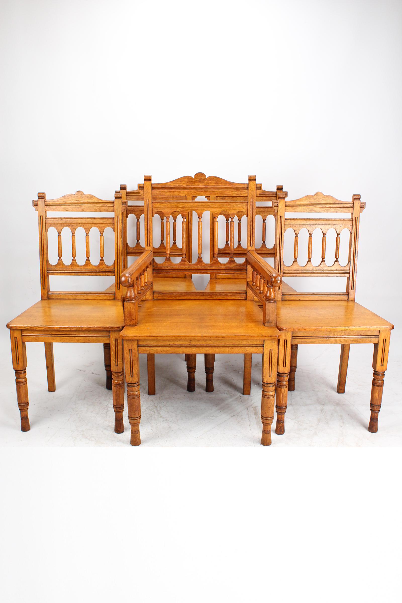 Set of 5 Victorian Gothic Revival Oak Chairs