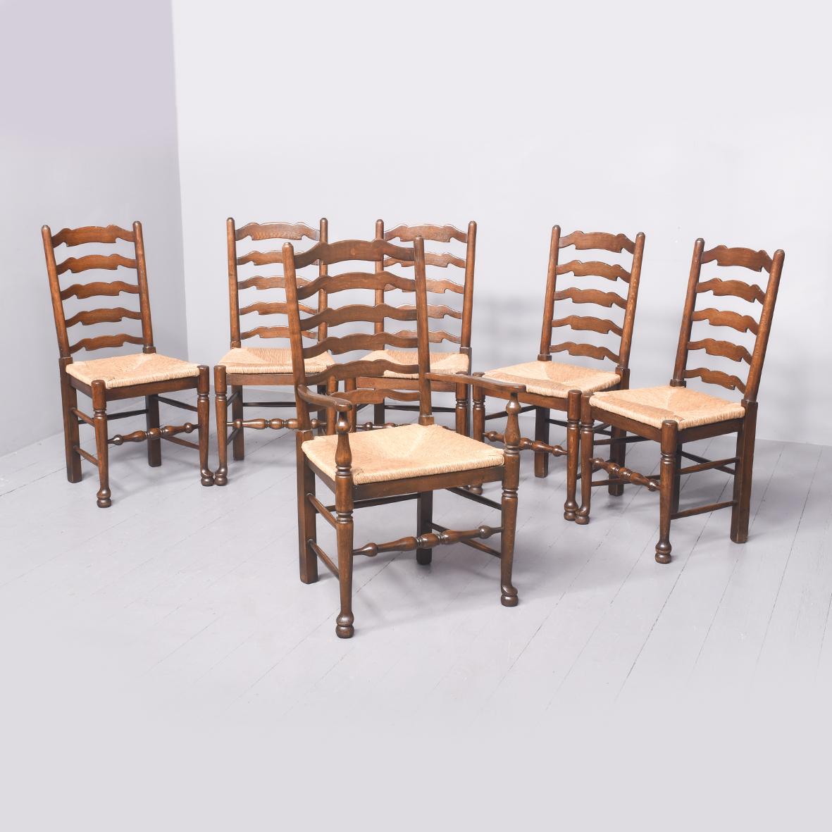 Set of 6 (5 Singles, 1 Carver) Ladderback Rush-seated Dining Chairs