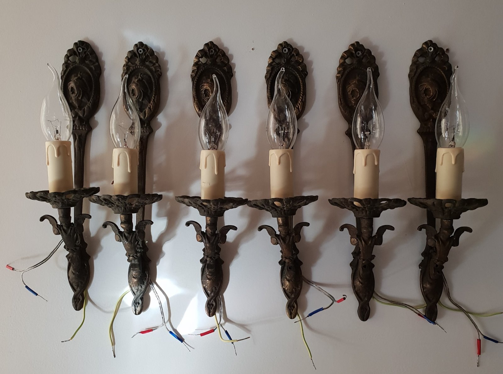 Set of 6 Aged Brass Single Stem Wall Lights, Rewired
