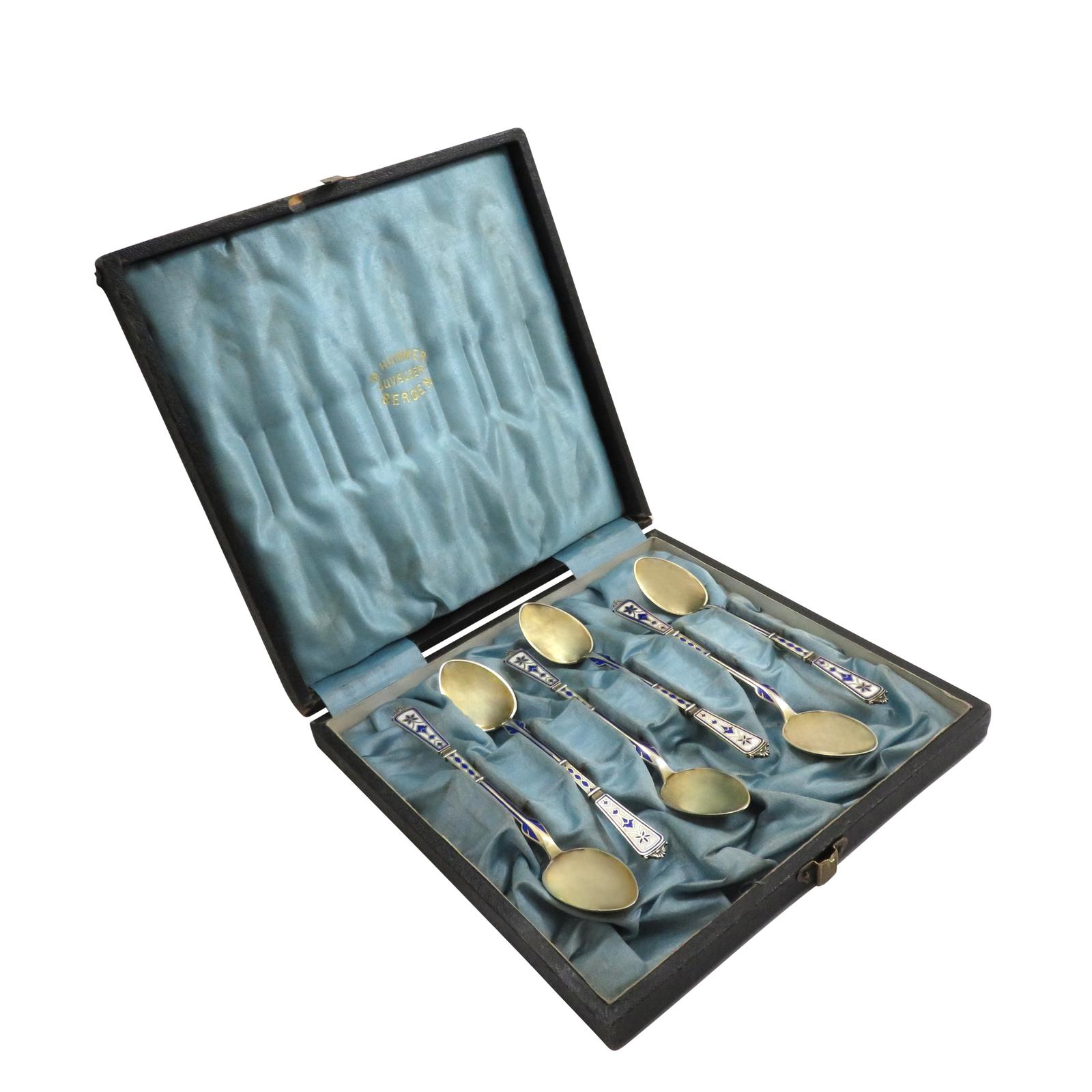 Set of 6 Antique Danish Silver & Enamel Teaspoons - Simon Groth c.1880