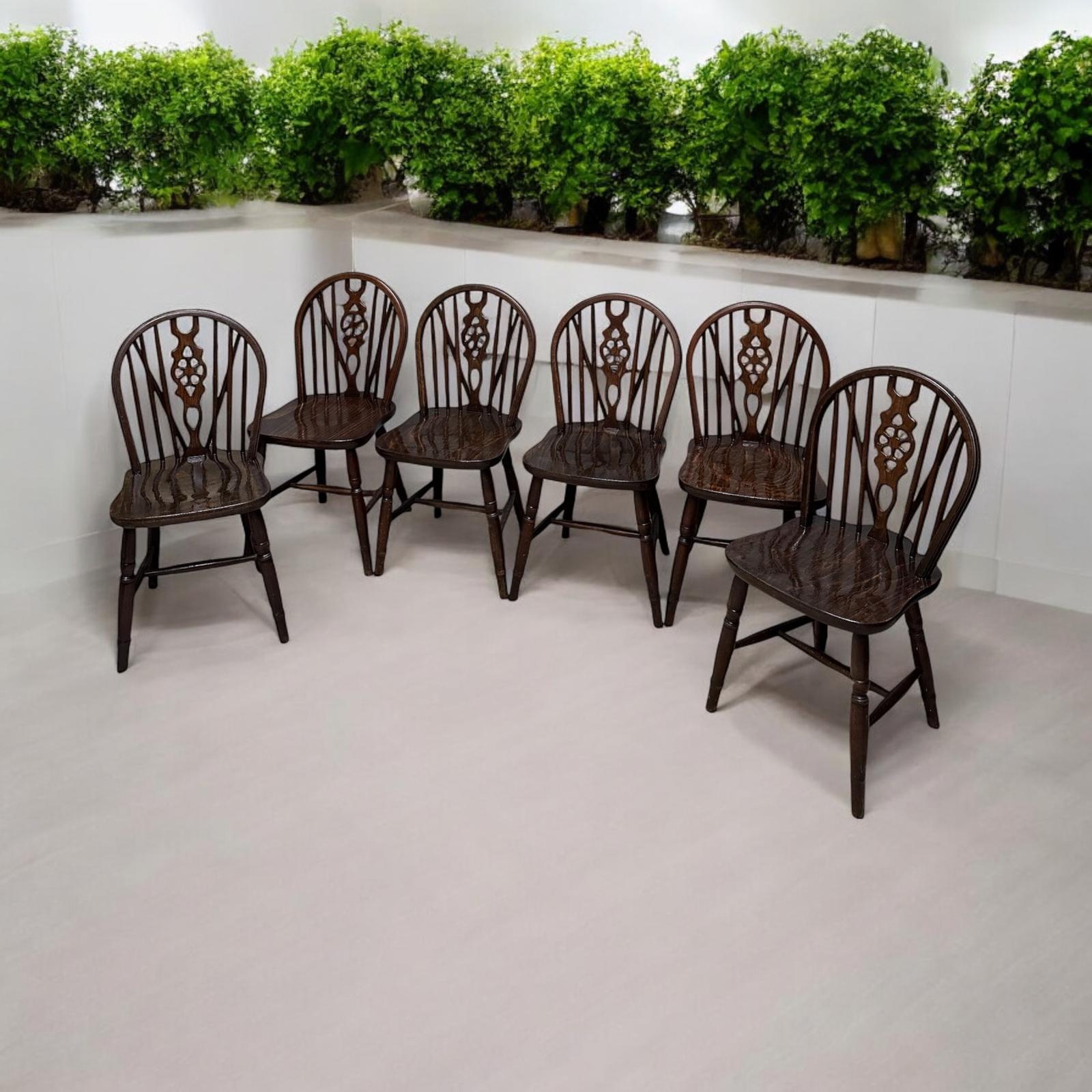 Set of 6 Antique Dining Wheelback Kitchen Windsor Chairs / Dark Brown Oak c.1920