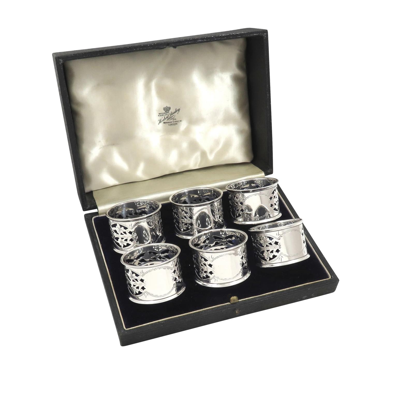 Set of 6 Antique Edwardian Sterling Silver Napkin Rings in Case 1909