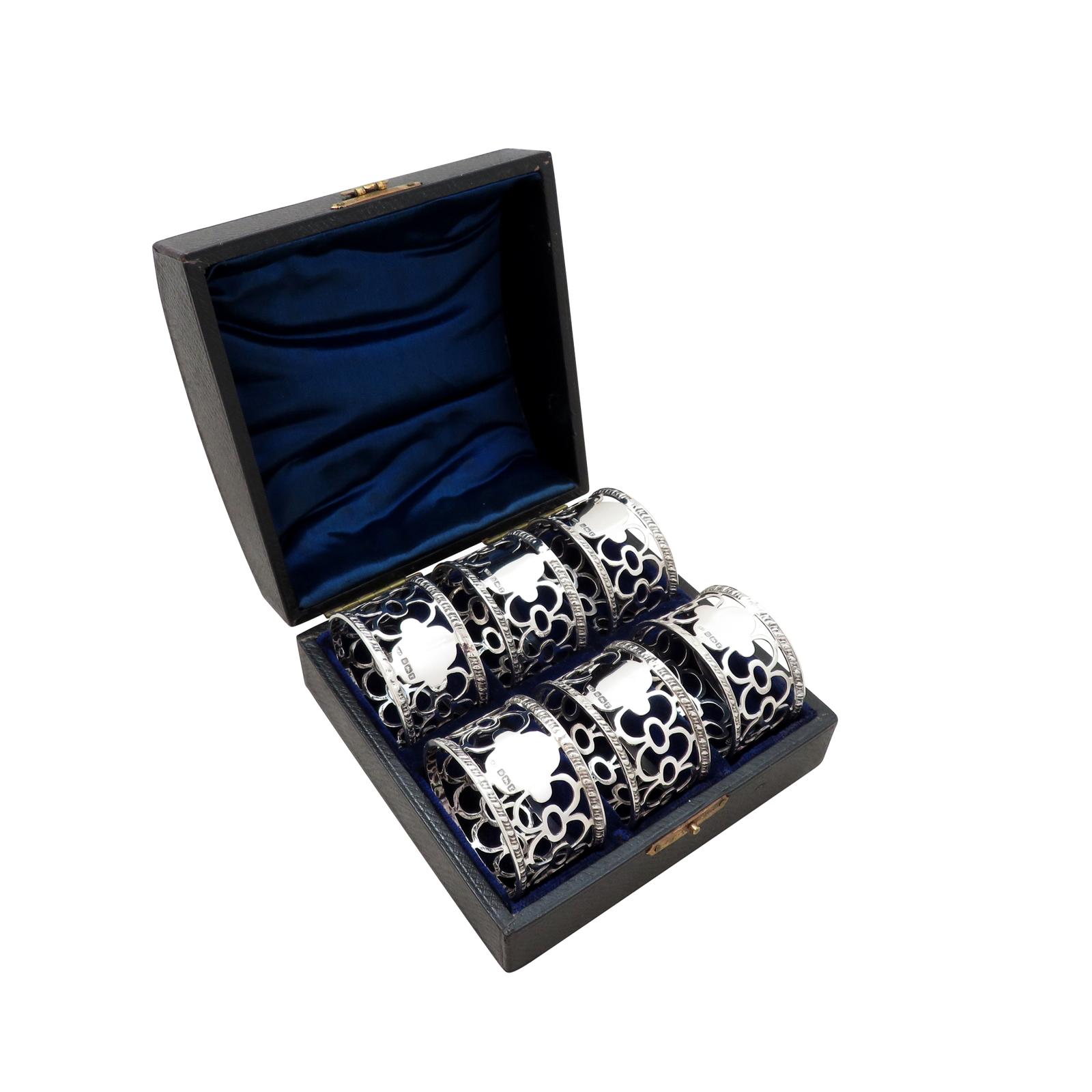 Set of 6 Antique Edwardian Sterling Silver Napkin Rings in Case 1909