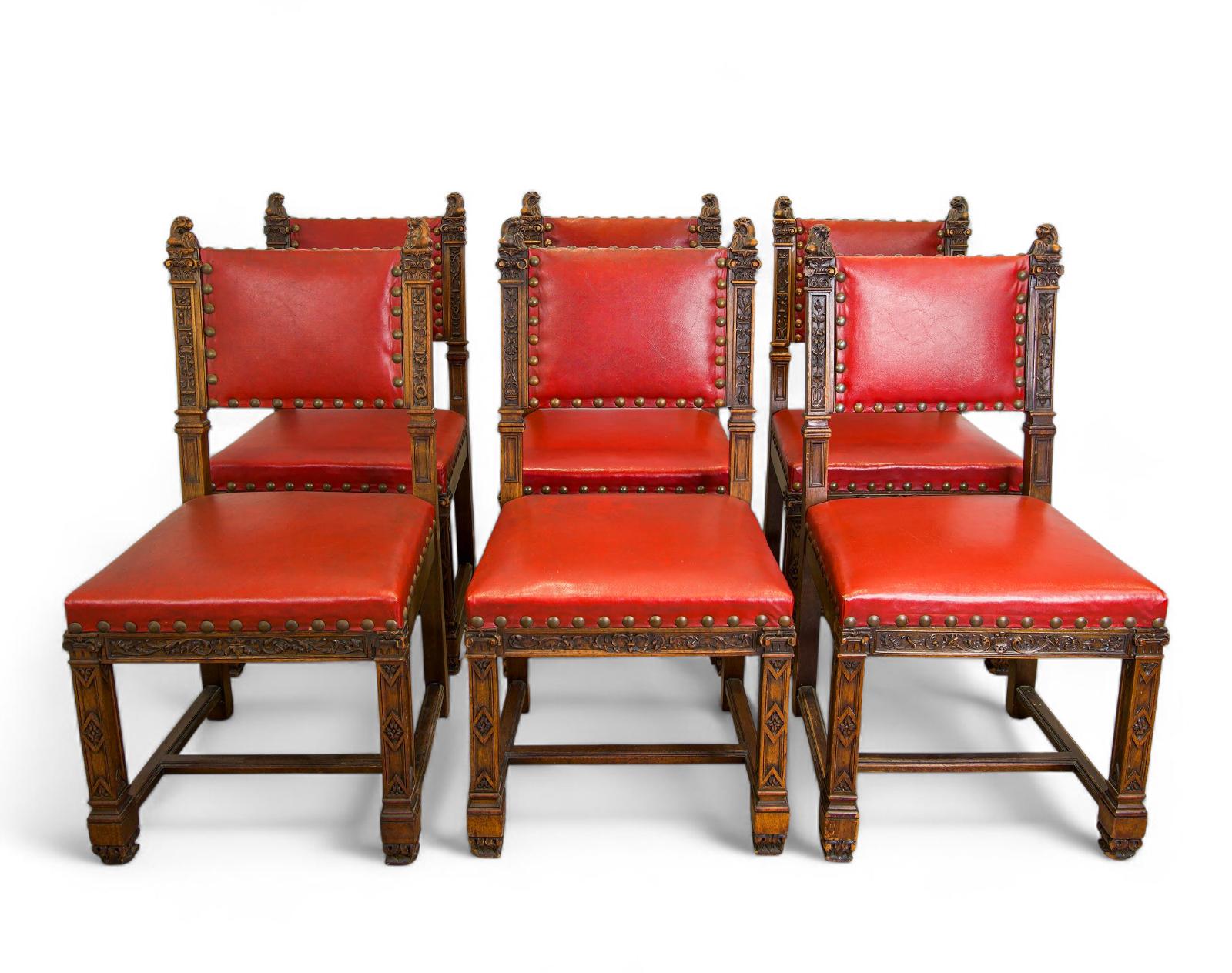 Set of 6 Antique Gothic Revival Oak Dining Chairs - Red Leather
