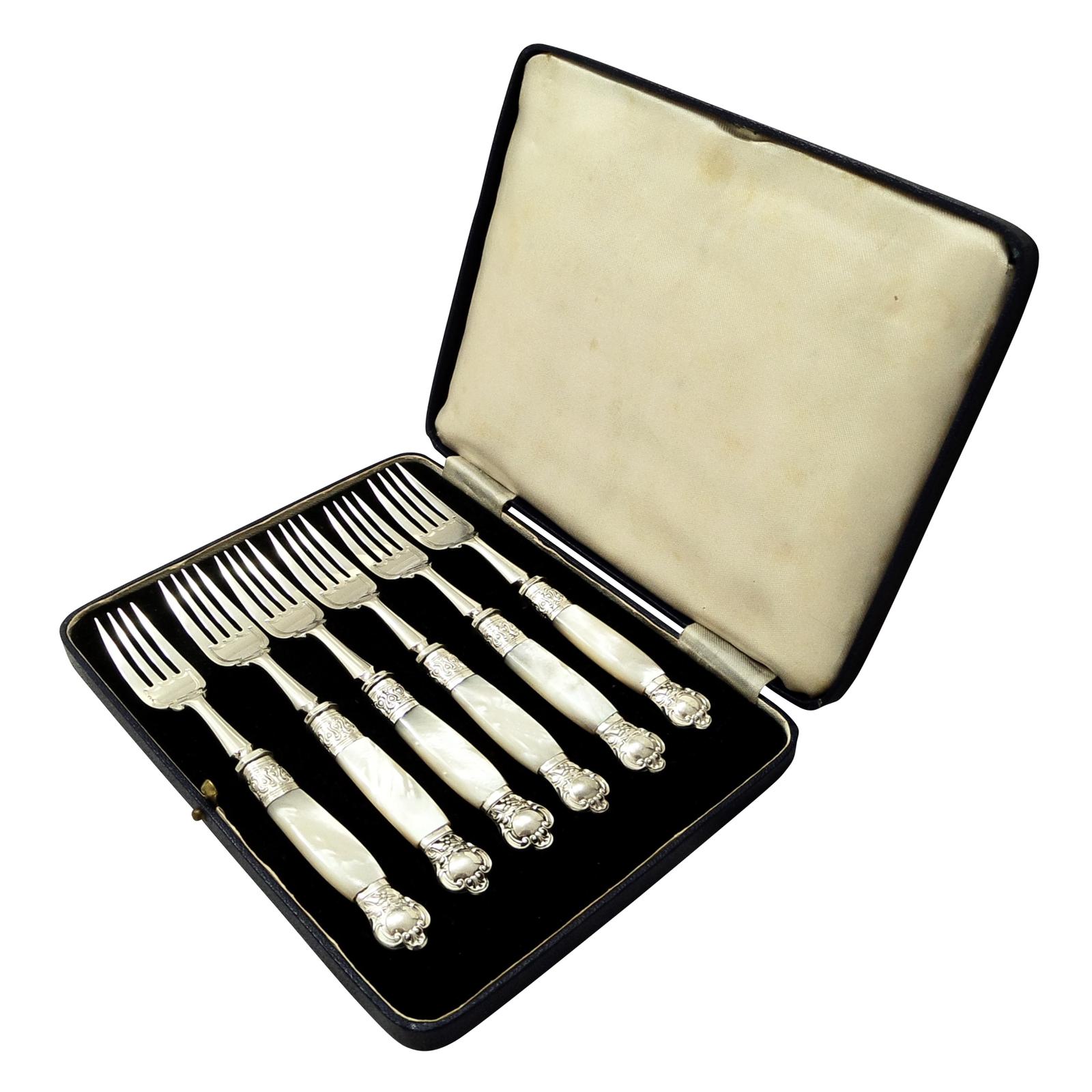 Set of 6 Antique Sterling Silver & Mother of Pearl Desert Forks 1903 / 1904