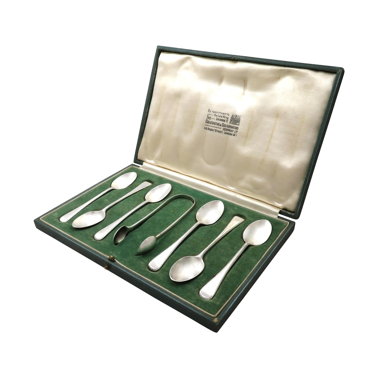 Set of 6 Antique Sterling Silver Teaspoons & Sugar Tongs in Case 1939