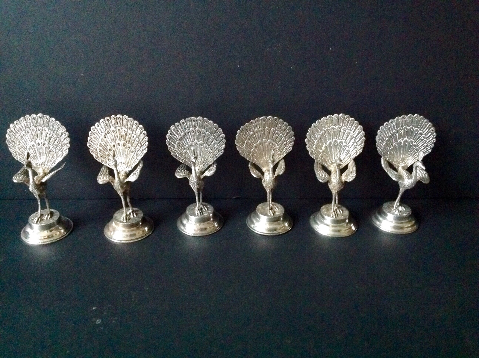 Set of 6 Antique Victorian 6 Silver Peacock Menu Holders 1897