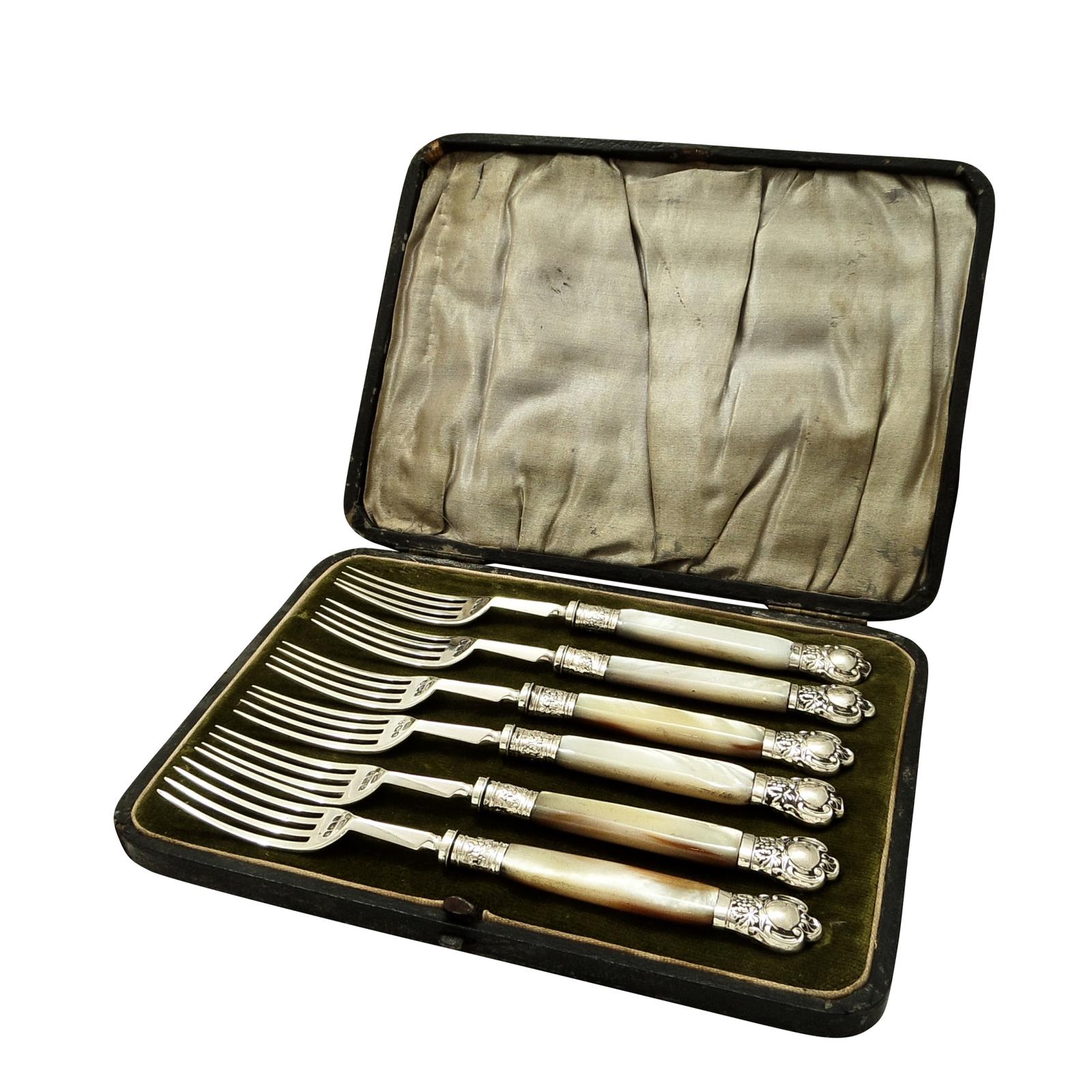 Set of 6 Antique Victorian Sterling Silver & Mother of Pearl Desert Forks 1896