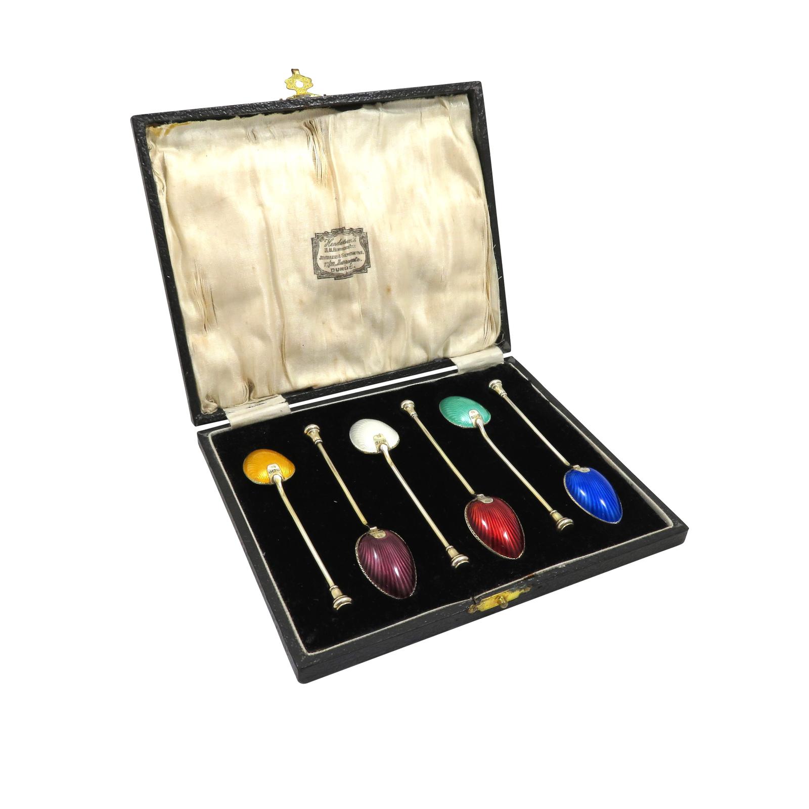 Set of 6 Art Deco Sterling Silver & Enamel Teaspoons 1937