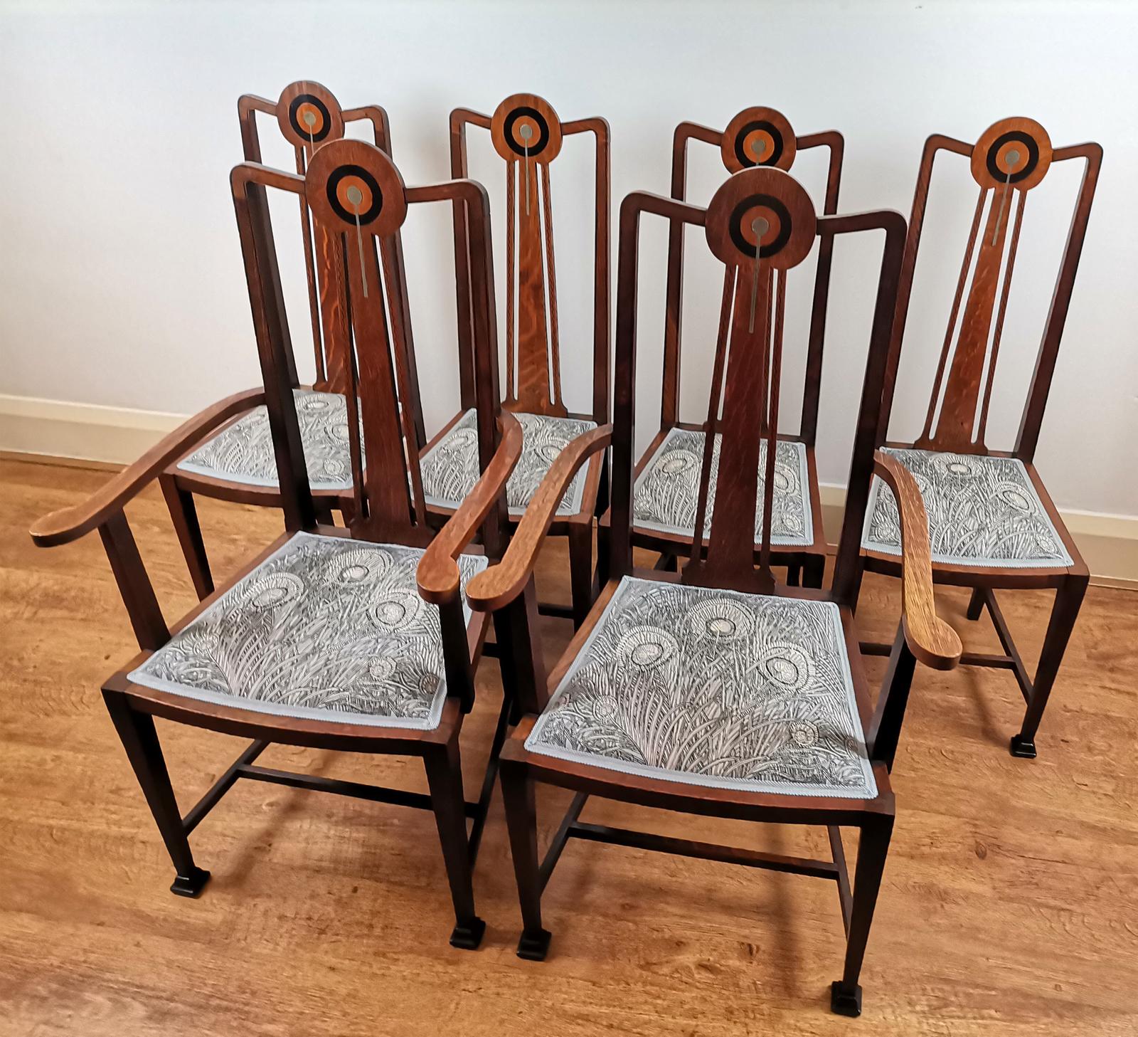 Set of 6 Arts & Crafts Pewter Inlaid Oak Dining Chairs