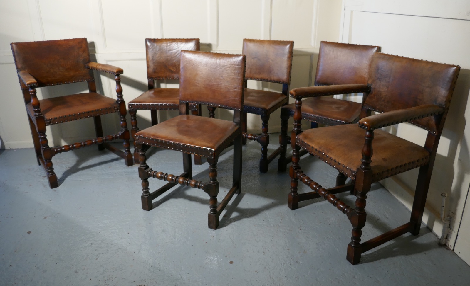 Set of 6 Gothic Oak & Leather Dining Chairs c.1890