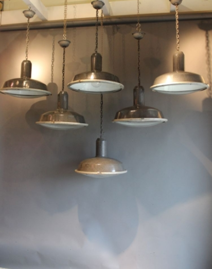 Set of 6 Large French Enamel Industrial Lights circa 1930