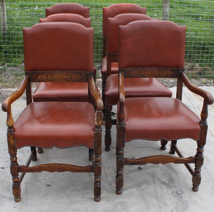 Set of 6 Oak Dining Chairs with Red Leather Seats. 4 + 2 Carvers c.1920