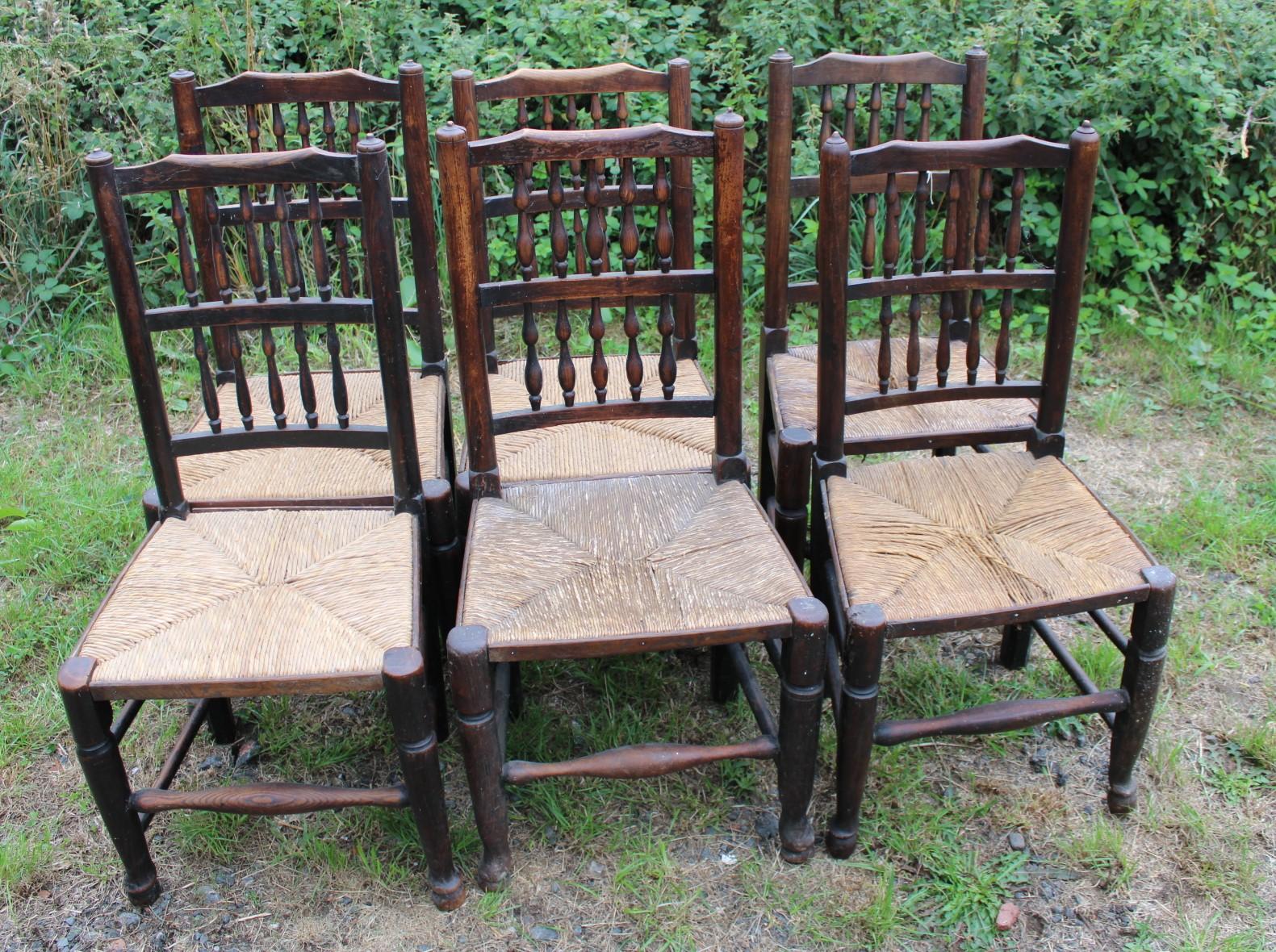 Set of 6 Oak Harlequin Set Spindleback Chairs Rush Seats c.1900