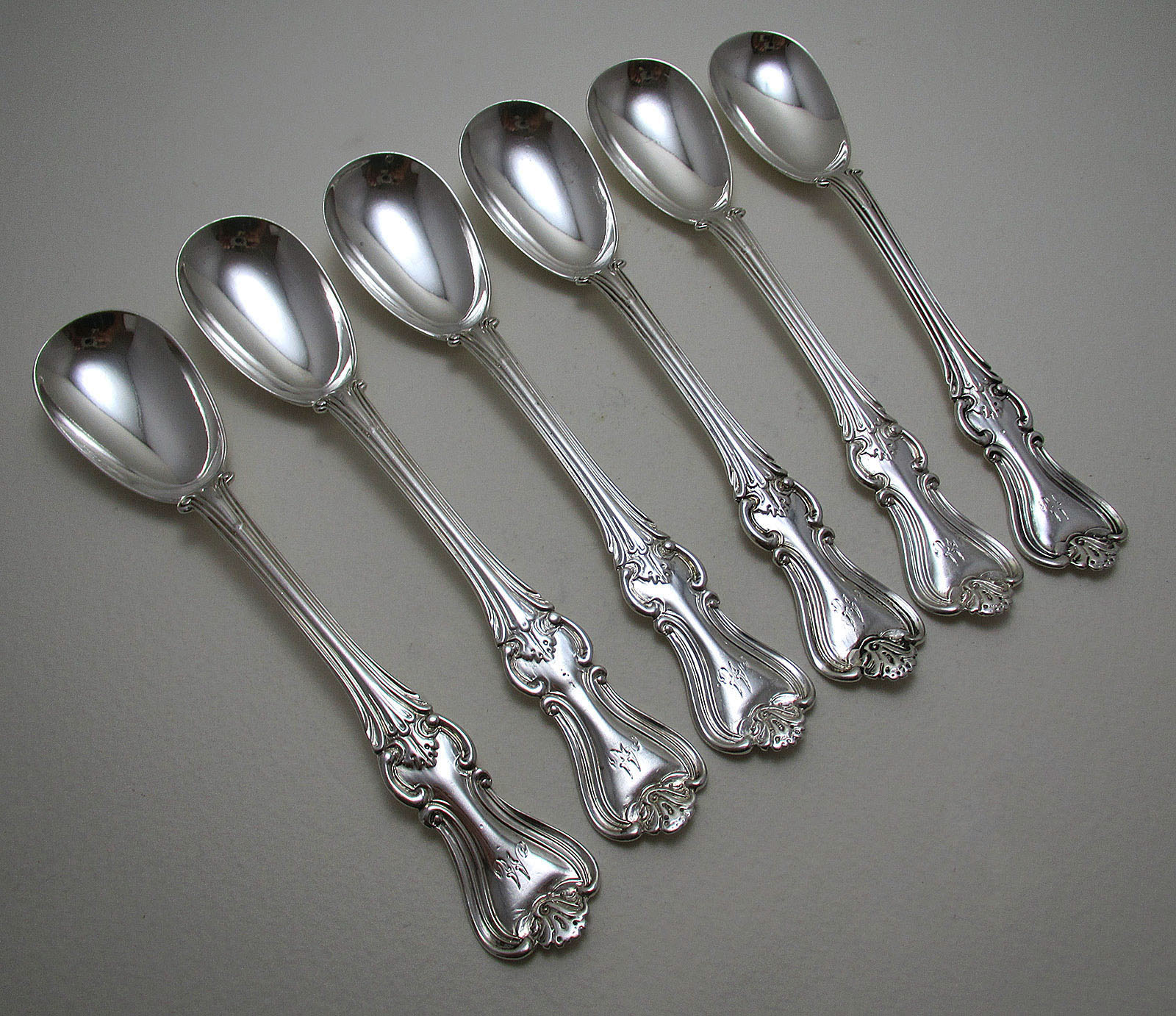 Set of 6 RAre 'Albert' Pattern Victorian Antique Solid Sterling Silver Egg Spoons. Monogram M. Kings / Shell. Scottish Glasgow Hallmarked