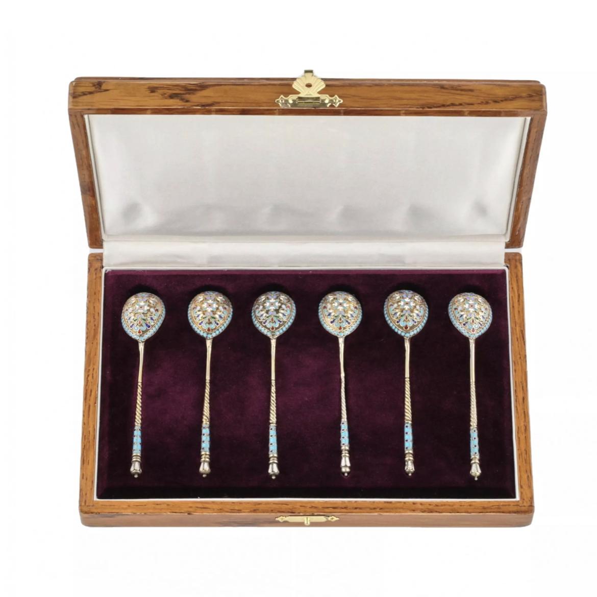 Set of 6 Russian Silver Teaspoons with Cloisonne Enamel