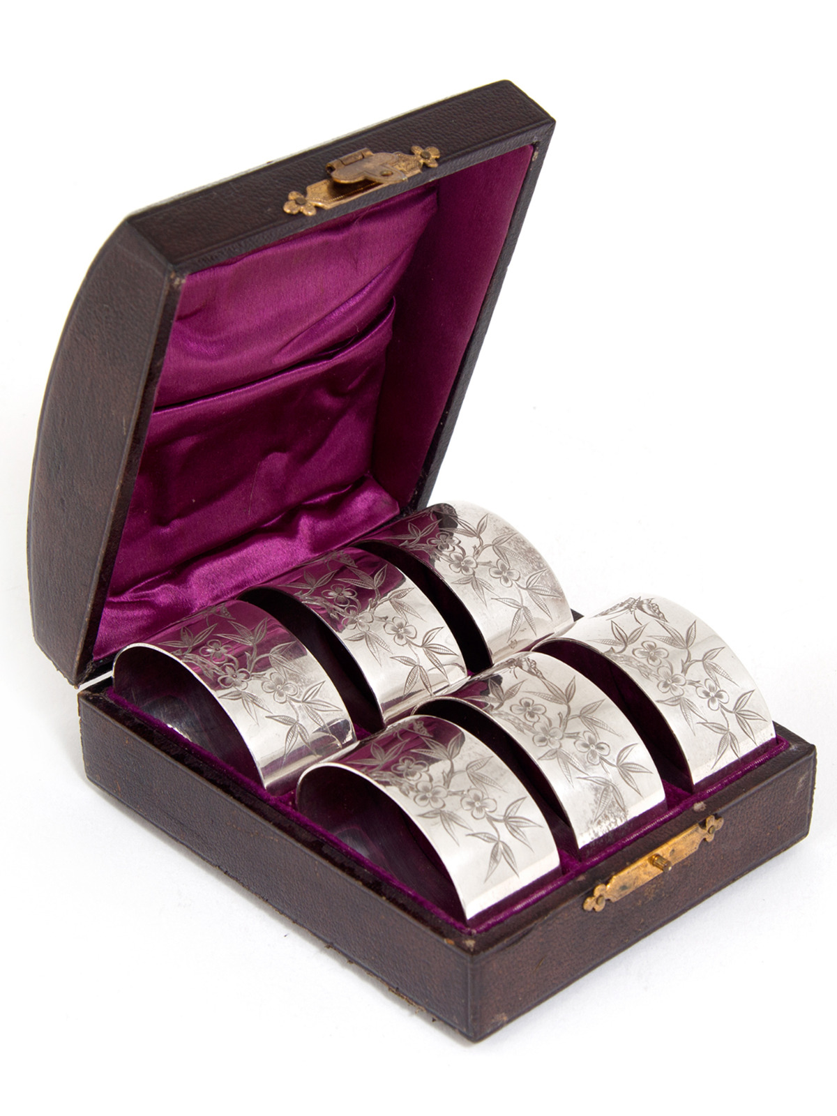 Set of 6 Silver Plate Oval Napkin Rings Engraved with Butterflies, Flowers & Foliage