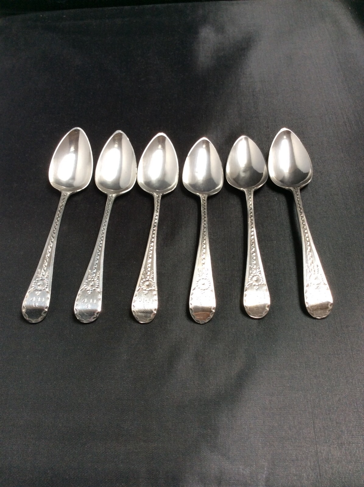 Set of 6 Solid Silver Georgian Bright Cut Tea Spoons
