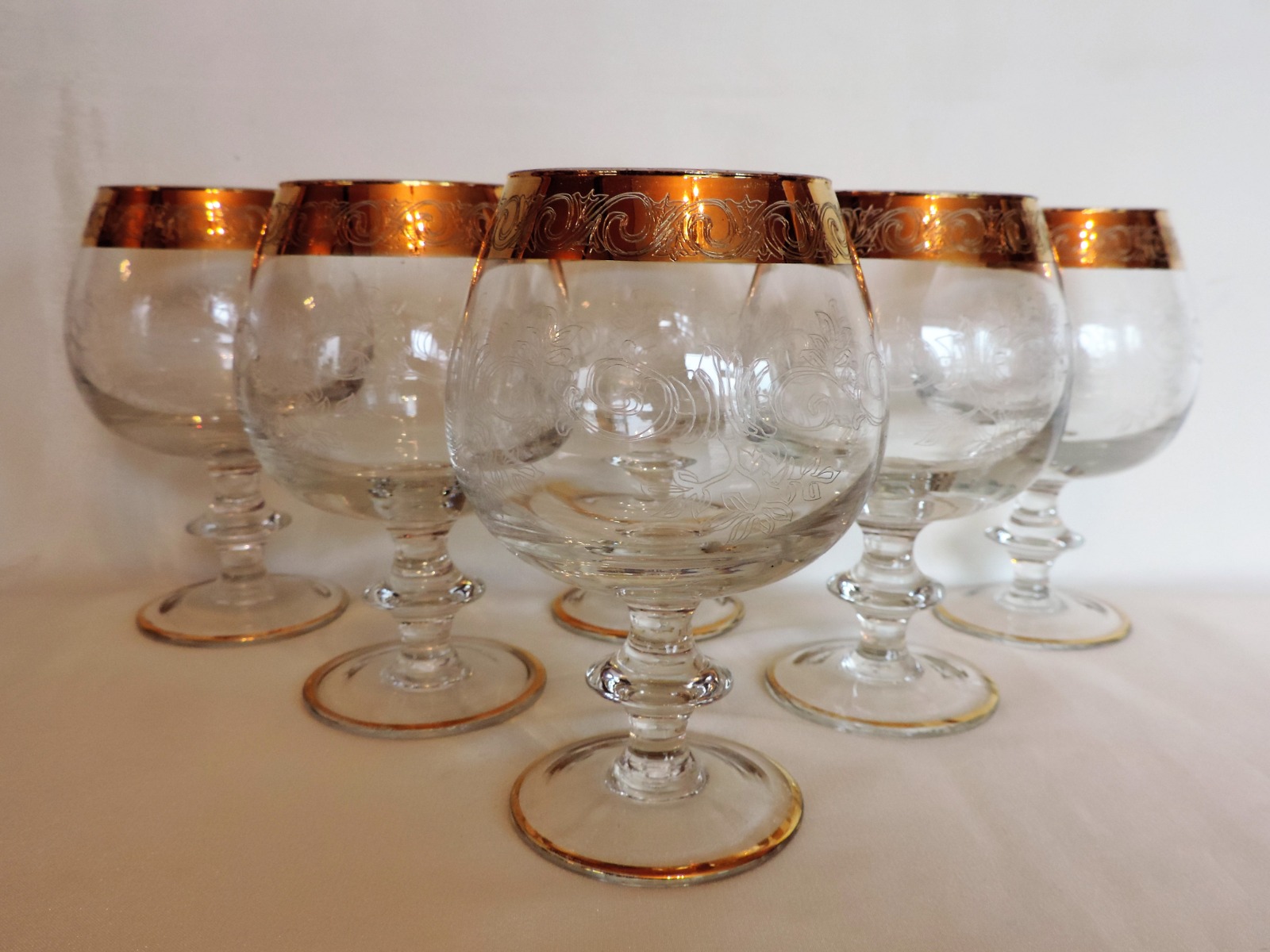 Set of 6 Venetian Glass Brandy Glasses 24K Gold Gilded Hand-made & Etched