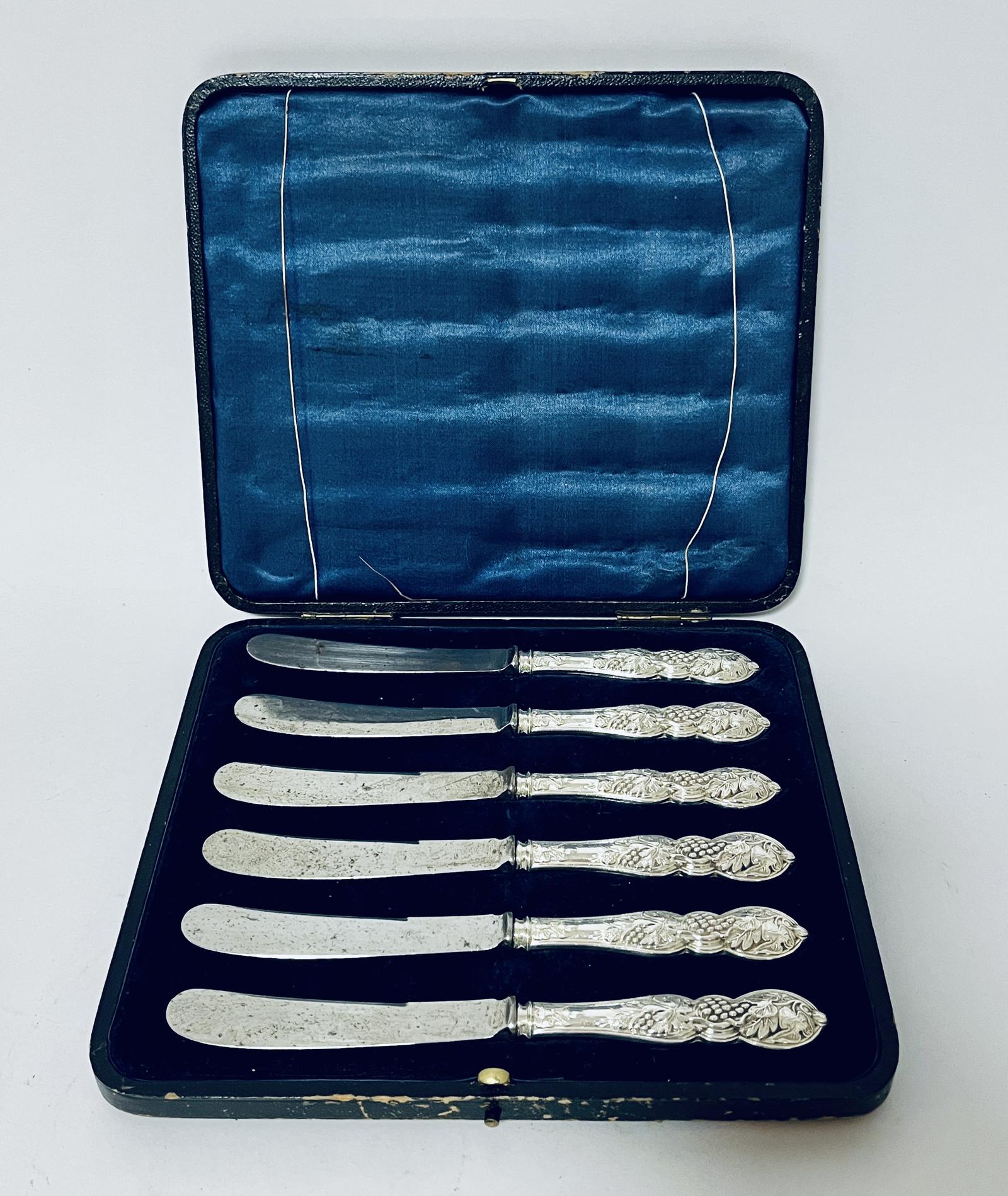 A good example of a set of 6 antique butter knives with sterling silver handles. They are good quality pieces with pretty vine and grape detail on the handles. They measure approximately 6 1/2" (16.5cm) long.