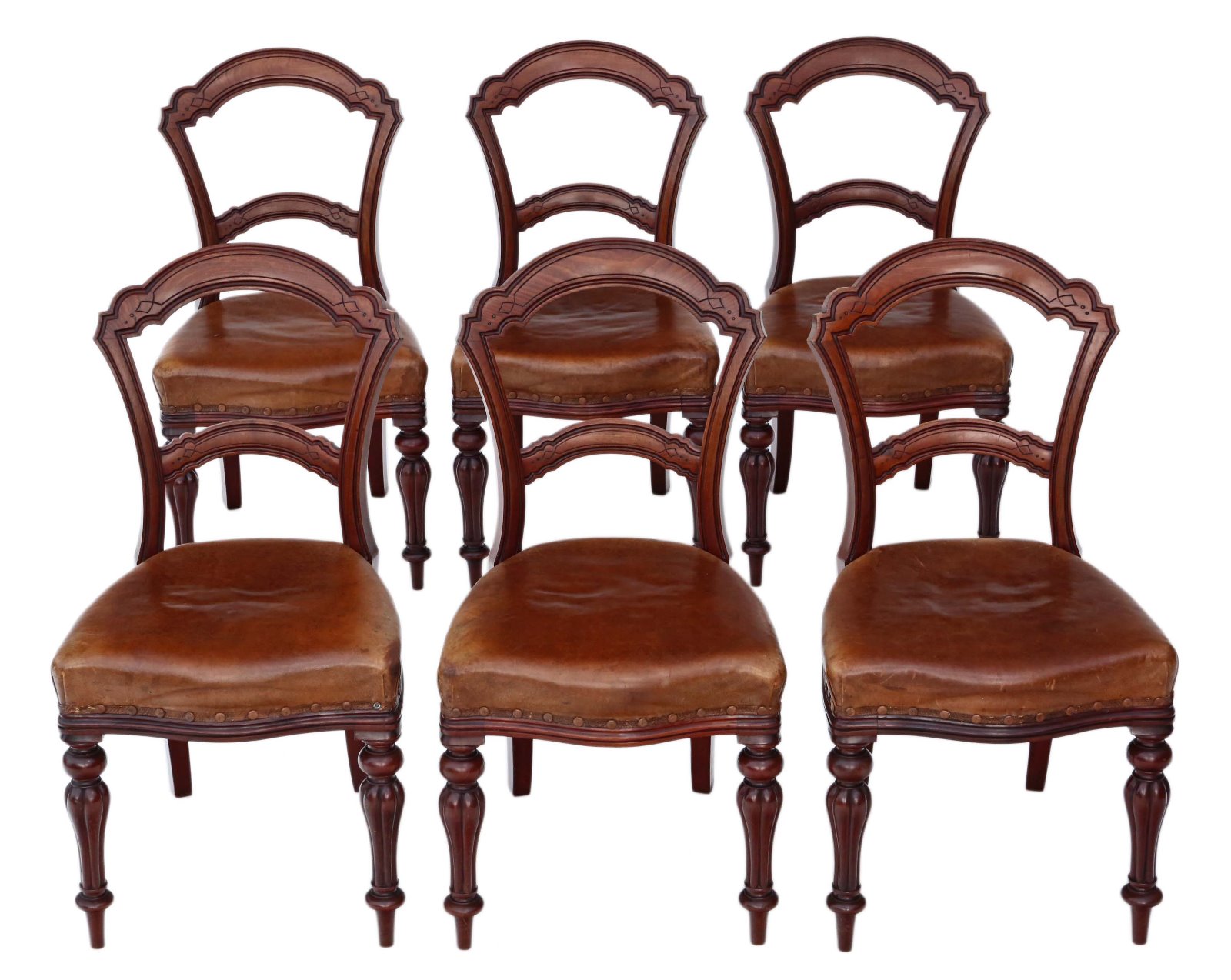 Set of 6 Victorian Walnut Leather Balloon Back Dining Chairs C.1880