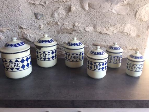 Set of 6 Vintage French Enameled Kitchen Storage Jars