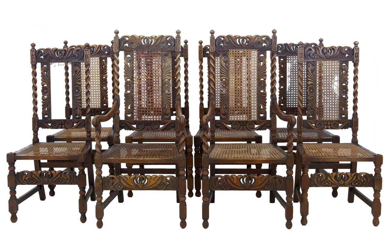 Set of 6+2 Carolean Influenced 19th Century Beech Dining Chairs