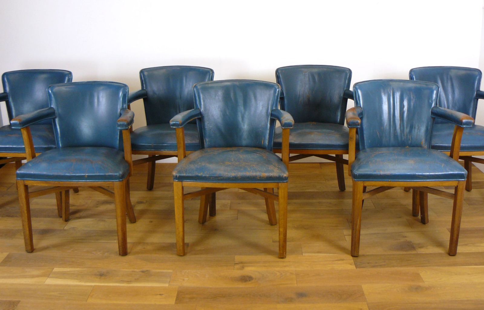 Set of 7 1930s Oak & Blue Leather Chairs by Hands of Wycombe Original Condition