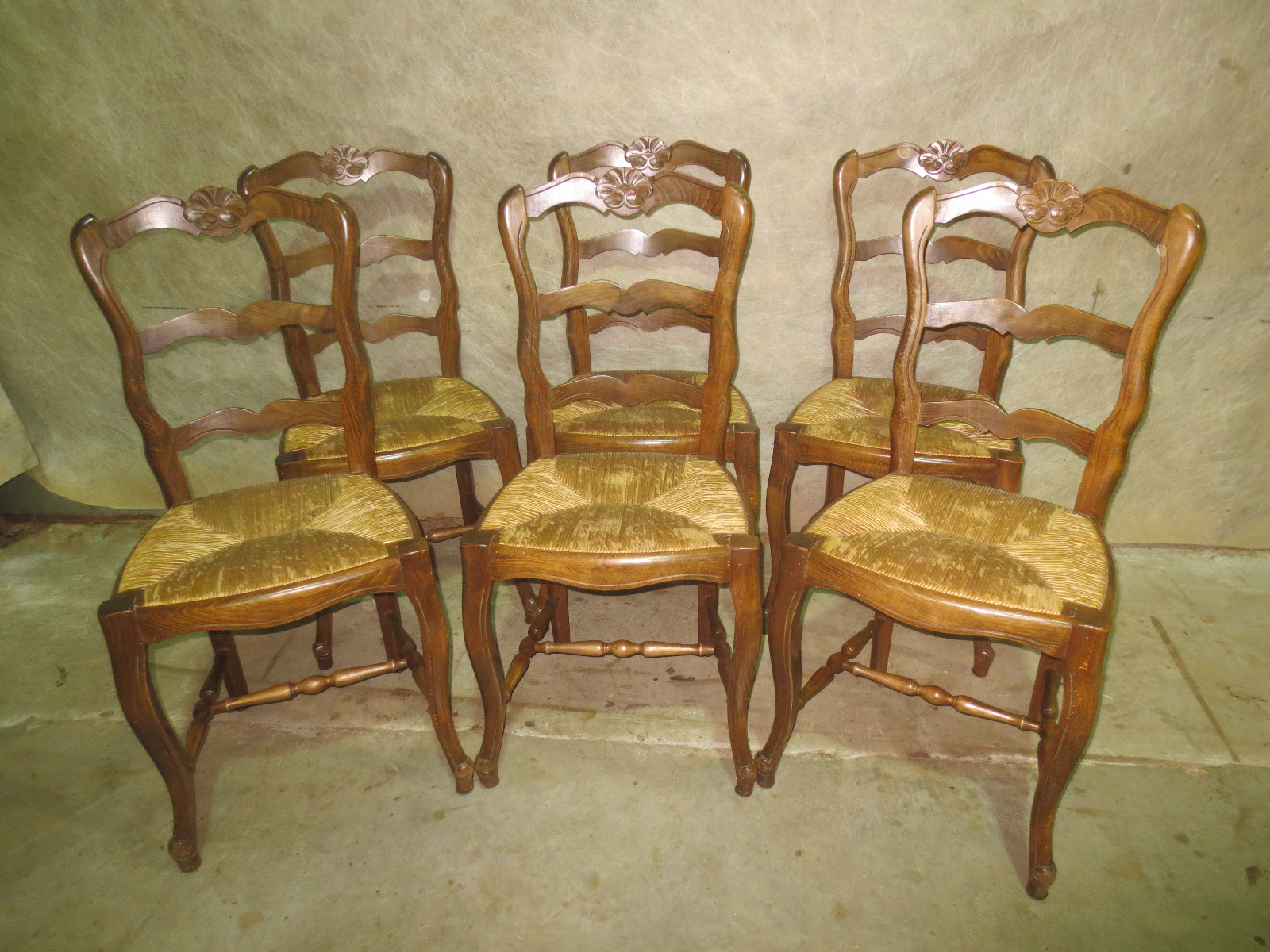 Set of 7 French Rush Seated Dining Chairs C.1920