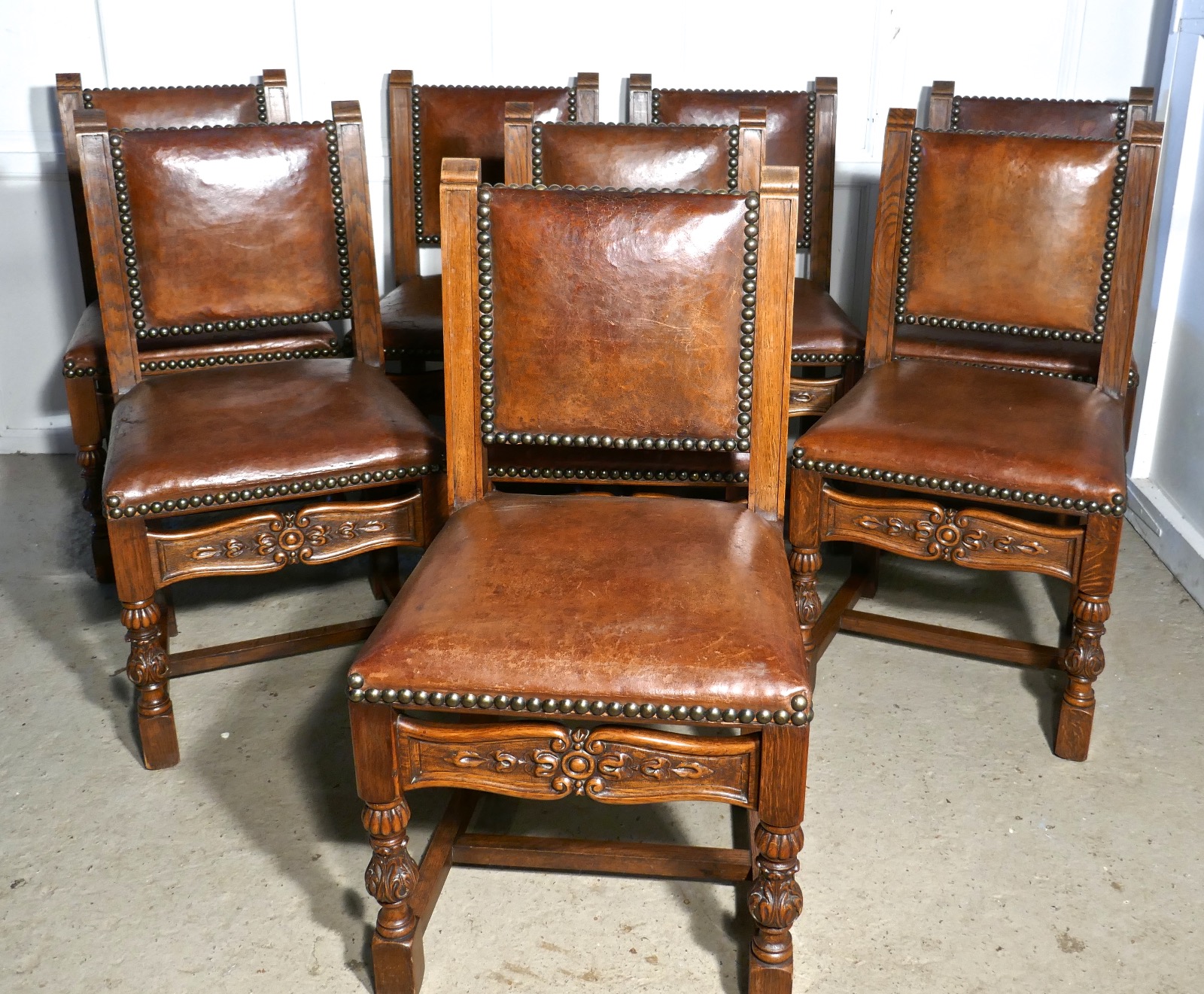 Set of 8, 19th Century Carved Oak & Leather Dining Chairs c.1880