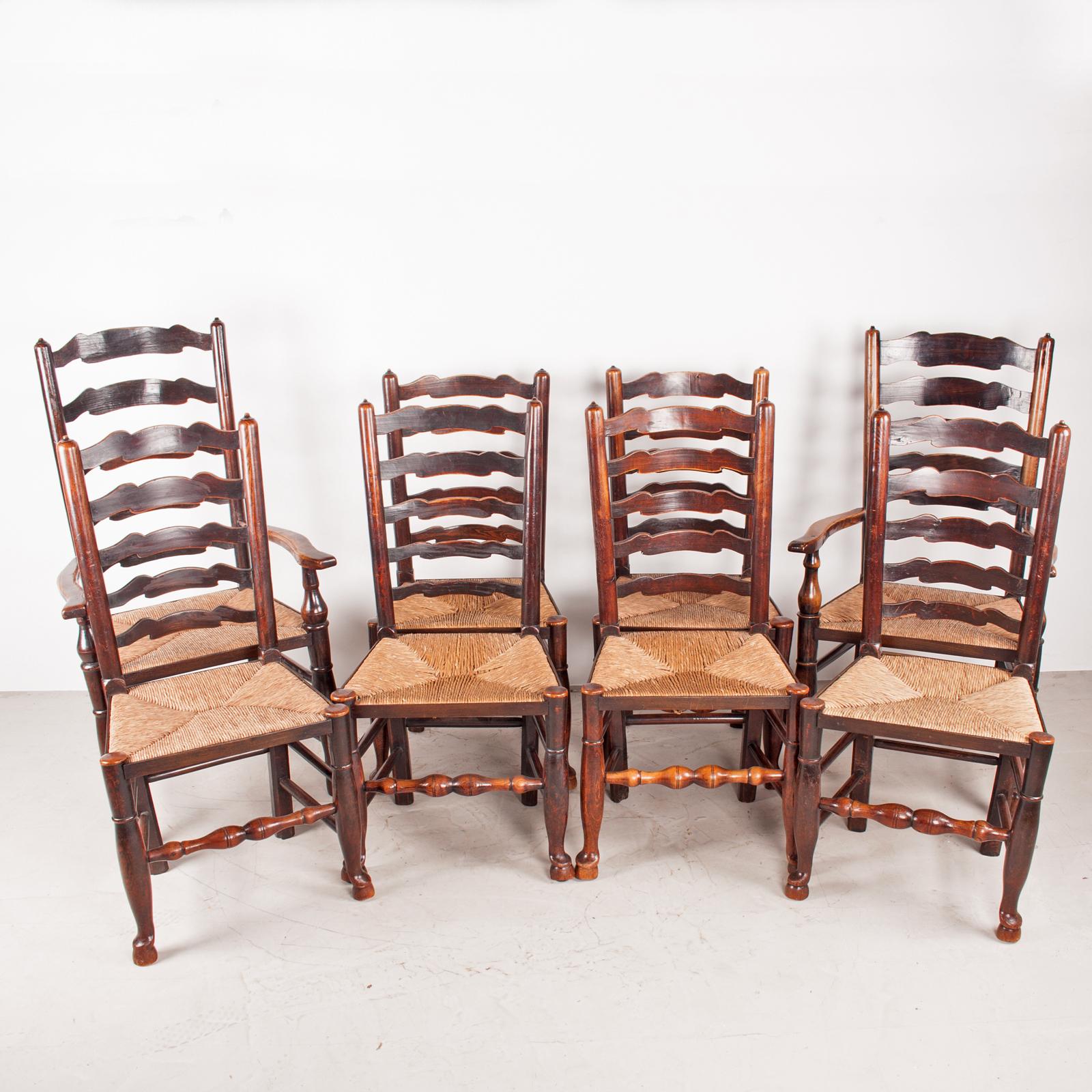 Set of 8 (6+2) 19th Century Farmhouse Rush Seated Ladderback Chairs
