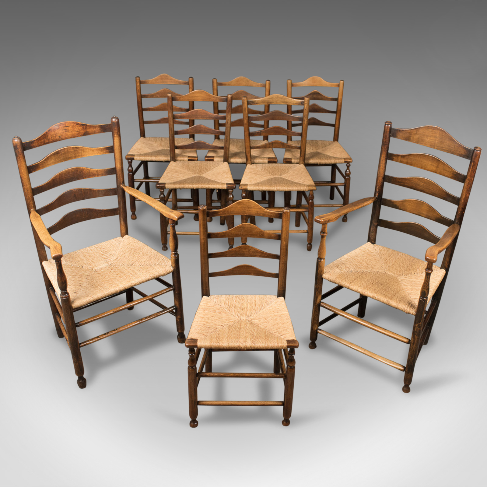 Set of 8 Antique Dining Chairs, English, Ladderbacks, Shaker C.1850