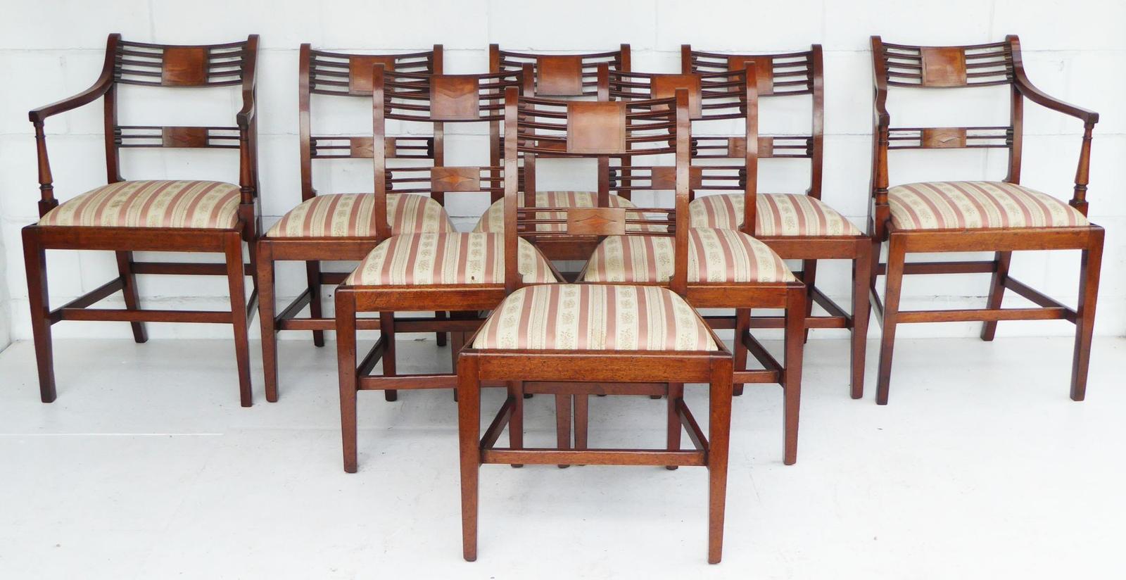 A well-matched set of eight George III period mahogany dining chairs, comprising six single chairs and a pair of carvers. The chairs feature elegant bowed top rails with finely pierced horizontal splat backs centred by shaped mahogany tablets, all raised on square tapering legs united by stretchers. The drop-in seats are upholstered in a striped fabric and would benefit from being re-covered, allowing the next owner to personalise the finish to suit their interior. A classic and well-proportioned Georgian design, suitable for both formal and country house dining rooms.