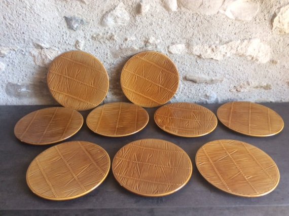 Set of 8 Gien French 1960s Treacle Glaze Straw Pattern Side Plates