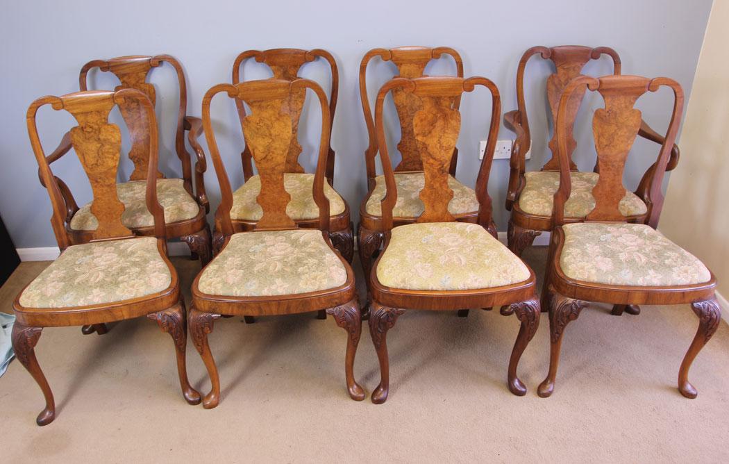 Set of 8 Queen Anne Style Burr Walnut Dining Chairs c.1920 (1 of 17)