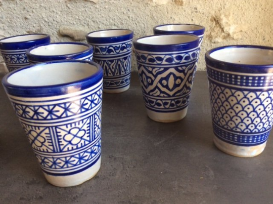 Set of 8 Vintage Moroccan Pottery Beakers in Traditional Flow Blue Pattern