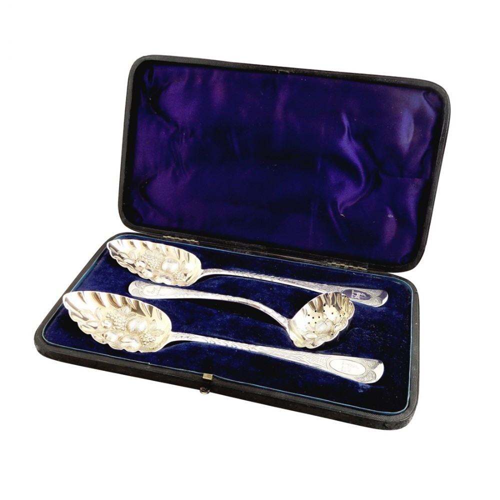 Set of Antique Georgian Sterling Silver Berry Spoons & Sifter in Presentation Case
