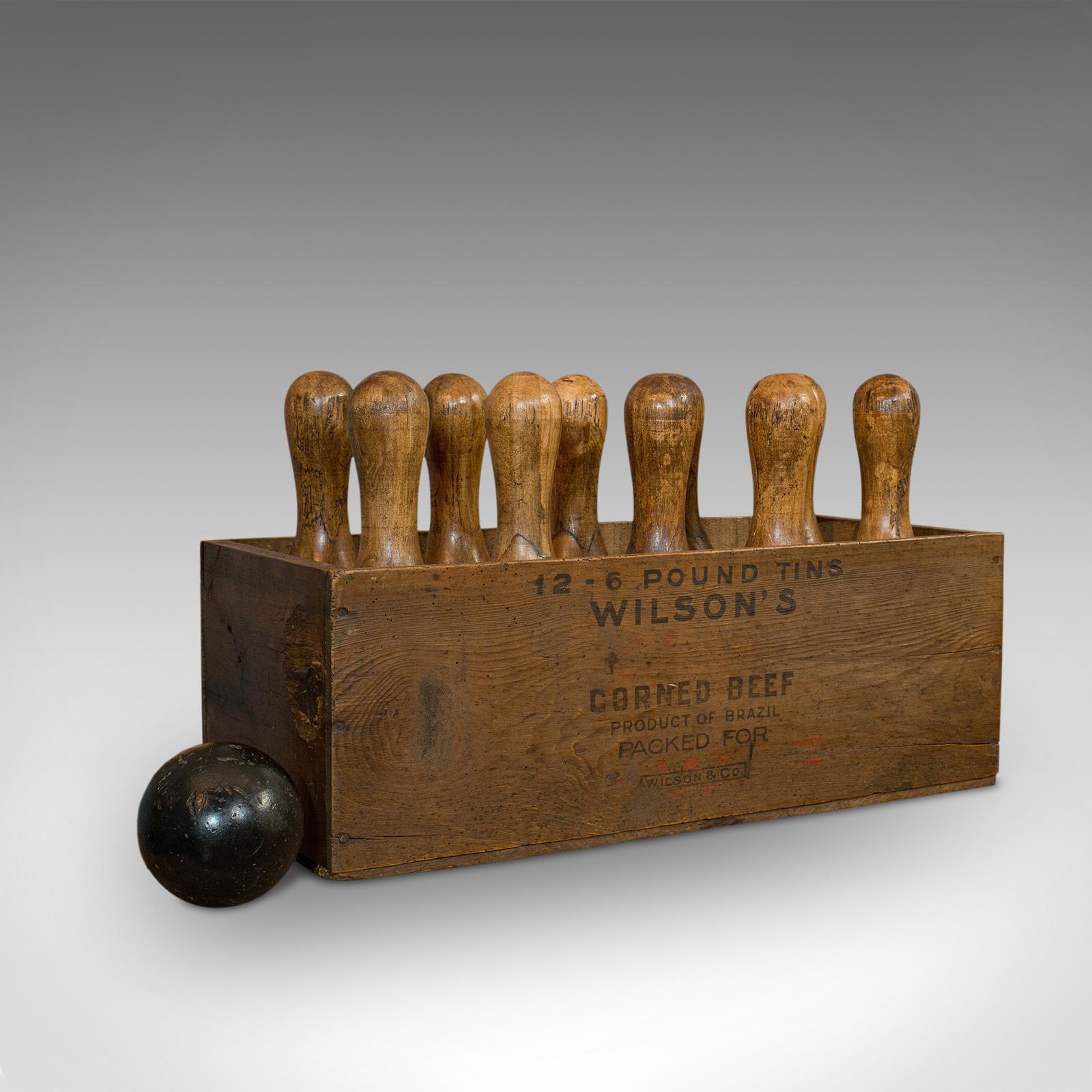 Set Of Antique Skittles, English, Beech, 10 Pins, Ball, Case, Victorian c.1900