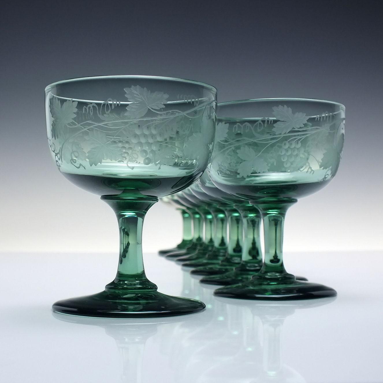 A rare set of eight champagne glasses from the late Victorian era, produced by Richardsons of Stourbridge around 1890. They have a stunning translucent green hue and have engraved grape vines with polished detailing on the coupe bowls. Polished pontils to the base of the feet.