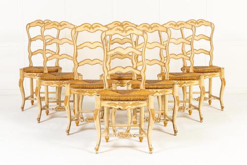 Set of Eight French Painted Chairs c.1940 These chairs, in the Rococo revival style, have rush seats and cabriole front legs, serpentine crest rails and modified ladderback-type splats. The chairs all retain their original off-white painted finish with gilded highlights and the decoration has aged beautifully, mellowing with time.
