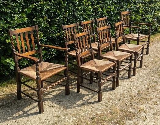 Set of Eight Oak Rush Seated Dining Chairs