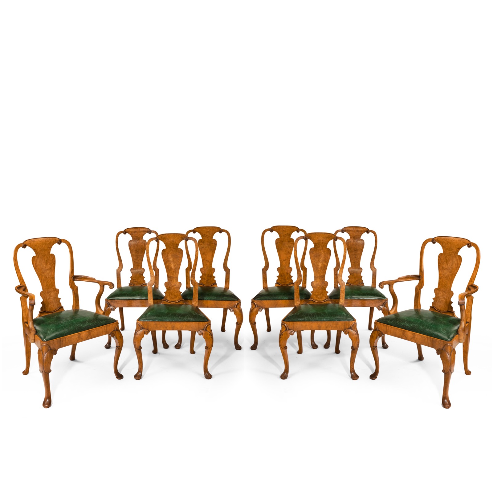 Set of Eight Queen Anne Style Walnut & Figured Elm Vase Splat Dining Chairs