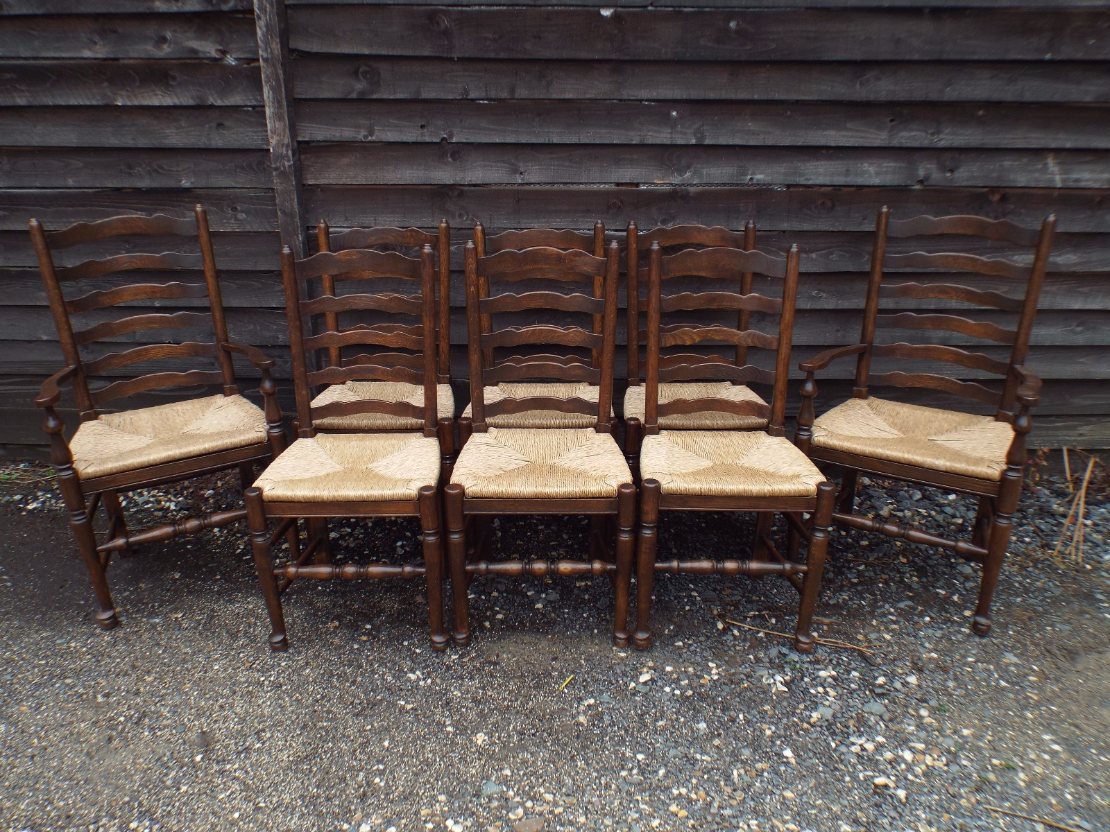 Set of Eight Solid Oak Ladder Back Rush Seat Dining Chairs
