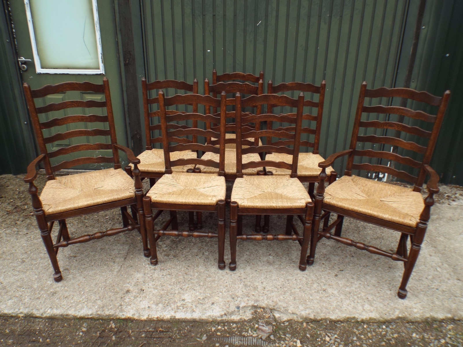 Set of Eight Solid Oak Lancashire Rush Seat Dining Chairs