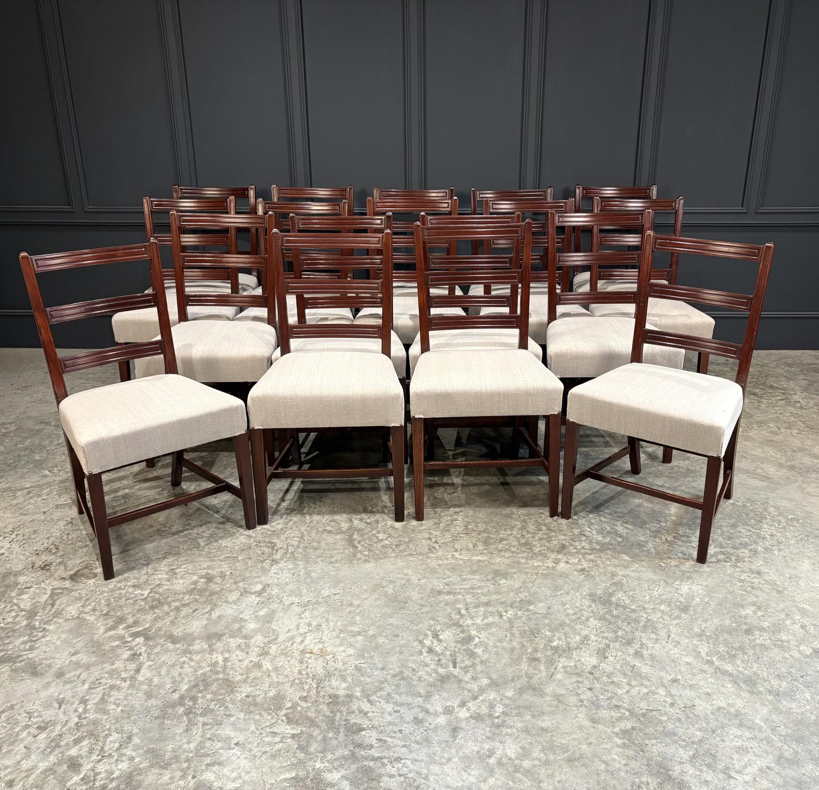 This is a rare set of eighteen Georgian mahogany dining chairs, offering a magnificent solution for large-scale dining with elegance and period charm. Dating from the late Georgian period, these chairs are finely crafted from solid mahogany, each chair features a classic ladder-back design with reeded horizontal rails, squared legs, and traditional H-stretchers, reflecting the timeless balance and symmetry of Georgian style.