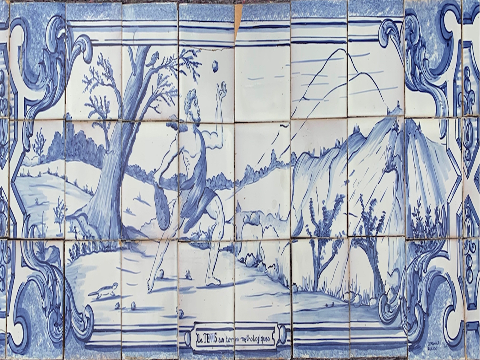 Set of Five Portuguese Faience Tile Panels, Various Scenes of Tennis Being Played, circa 20th Century