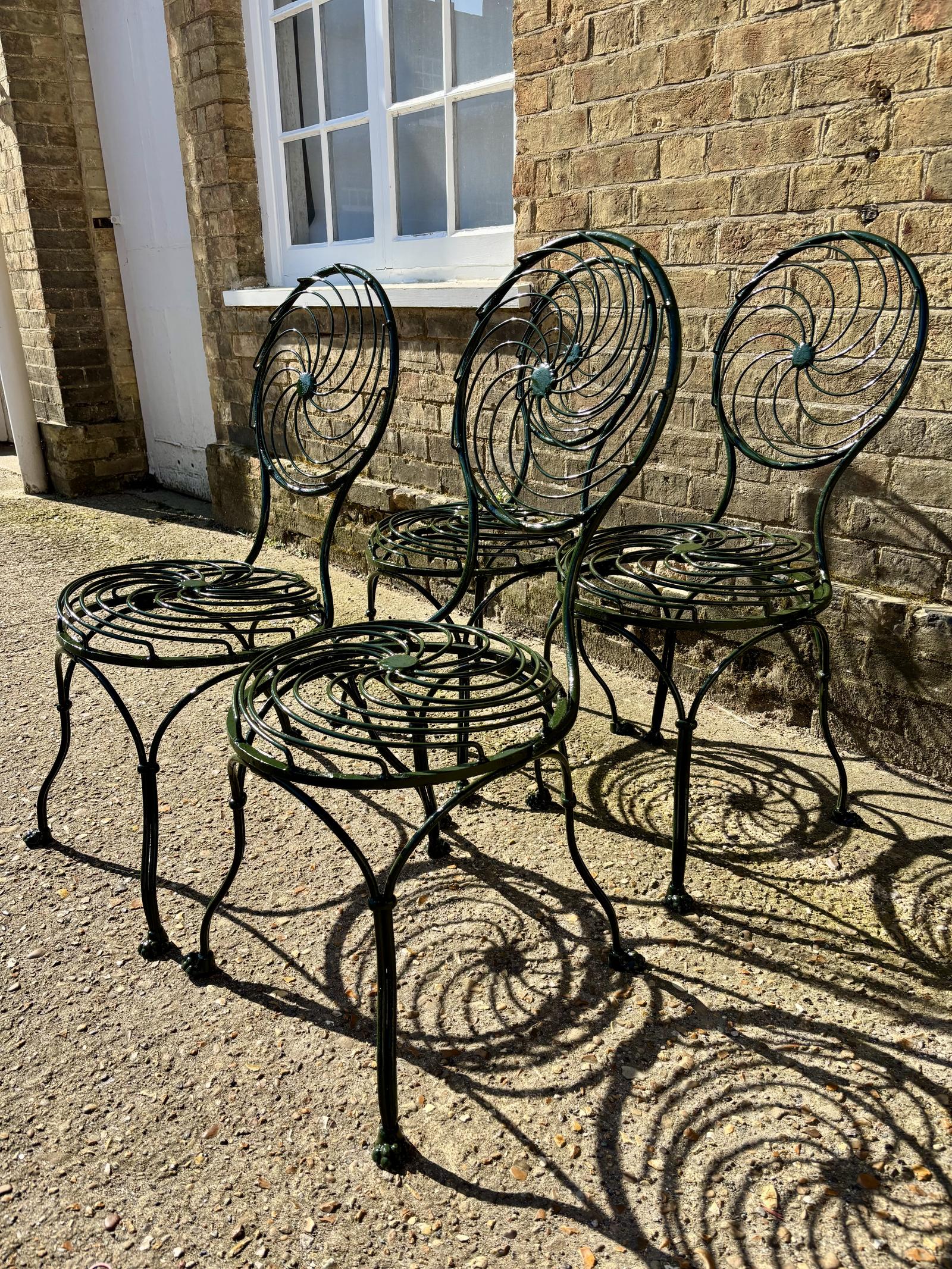 The chairs have recently been sympathetically restored by a blacksmith. During the restoration the spiral sections forming the seats and backs were carefully remade, and the central bosses renewed where required, ensuring the chairs are once again strong, stable and fully usable while retaining their original frames, cast feet and overall historic character.